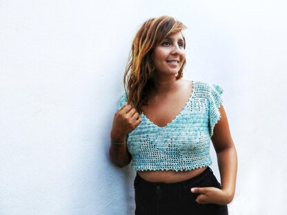 Neverland is a whimsical, simple top with a touch of innocence. The fillet crochet design on it gives the appearance of fairy dust falling over the mountains. It can be as long as you wish with flary sleeves and a V neck that can be worn at the front or back. The pattern comes with written instructions and charts for the bottom fillet design.