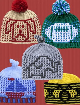 Outfit your newborn baby boy in these sweet hats (most are really gender-neutral). Choose between puppy dog, elephant, bee, football or sailing (sailboats), or why not make them all! Main design of each hat uses mosaic dropped dc technique which is formed by cleverly placed dropped dc stitches worked in front loop of stitch 2 rnds below and sc worked in back lp of st. All color changes are done at beginning of rnds so you are only working with one color at a time. Unused yarn color is carried up at seam, so not many ends to sew in! See my website for a how-to video tutorial showing just how easy this technique is to do. Make them using baby, DK or sport weight yarn. Instructions given for sizes 2 weeks-3 months and 3-6 months plus suggestions for making larger sizes. Written instructions included plus optional graphs. Easy to intermediate skill.