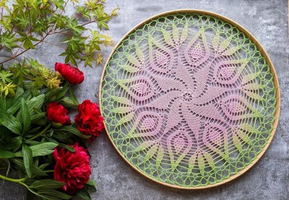 Materials used: • 1.75mm hook (or if you crochet tight like me hook size 2mm might be better)• Around 60g / 300m 3 ply yarn (I used 3 ply 50 % cotton/ 50 % acrylic block gradient cake from Crochet UK in custom colours as follows: 555, 585, 265 & 390), but any 3ply yarn will work. This amount will be enough to crochet mandala onto the hoop or wrap it around hoop if using metal one. • Ring to attach mandala - I used 45 cm wooden ring