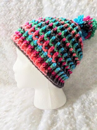 This pattern calls for 180 yards of a worsted weight acrylic. (Featured is Red Heart with Love Stripes in colorway Leisure Stripe. The entire hat including pom-pom was made with one skein.) Also needed is a K-10.5/6.50mm hook, tapestry needle, scissors, and a medium pom-pom maker (or the pom-pom maker size of your choice.)