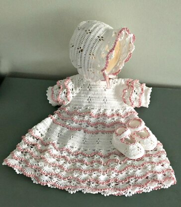 This pattern file includes instructions for a dress, bonnet, and shoes. Also included is a simple printable slip pattern that can be trimmed with crocheted lace to match the dress.