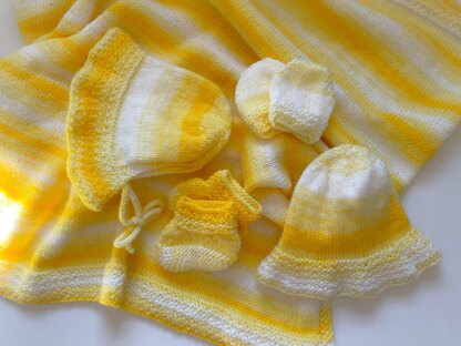 Newborn Sun Bonnet Gift Set Knitting Pattern includes instructions to create 7" Sun Bonnet with ties, Hat 12" circumference and 6.5" tall with floppy brim to protect them from the sun, blanket size 28" x 29" no scratch mittens and matching booties. 3 ply baby yarn used to create this set. Skill level is moderate, knit, purl, short rows, flat knitting, knit in the round. US size 6 (4.0mm) Canadian/UK size 8 double point and circular needles needed. Pattern includes a materials list and detailed instructions (in English). PDF is a 4 page down load with the written instructions and photos. (465 KB)