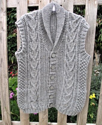 A modern, interesting take on a classic gilet. There’s lots of super texture with its aran-style patterning, side pockets and roll collar. The collar is worked in garter stitch with shaping on the inner edge only. The lower edges, armhole borders and front borders are all worked in 2/2 rib. Full instructions are given for reversing the buttonhole border for women.