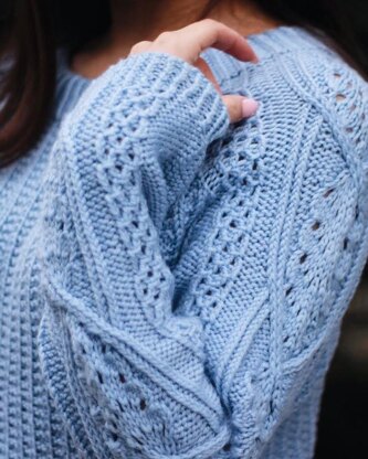 Nicolas sweater is knit in 1 piece, top-down in the round. It features a raised back, and extensive textures and cabled patterning.
