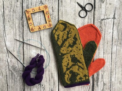 Use any plied wool yarn you can knit to the required gauge for the outer mittens. (We liked a lighter color for the MC and a darker version for the CC because it looks like dark shapes at night.) Fine luxury yarns that make great mitten linings seem to come and go. If you can’t find the required lining yarn, feel free to substitute any lace or fingering weight yarn that will be a treat for your hands. I like alpaca, mohair, and cashmere and blends.