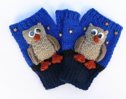 Novelty fingerless mittens in DK yarn, with instructions in four sizes to suit ages 3 years to adult, featuring a separately knitted owl motif. The pattern is in PDF format on 4 pages, with row by row instructions.