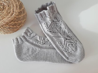YARN 1 skein of Kettu Yarns Wooly Sock Sport (75% Superwash Virgin Wool, 25% Biodegradable Nylon; 260m [284yds] per 100g skein (or any other heavy sport weight/DK weight yarn with similar yardage). The sample socks were made in the colorway ”Fog” and they used approx. 161m/176yds of yarn.