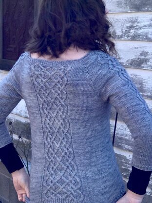 Nimiane is a delicately cabled, top-down raglan cardigan. The intricate cable runs down the back, with reflected versions of the same cable on the sleeves. There is no finishing work, as the button band is integrated as you work the cardigan fronts. Optional waist shaping instructions are included. Nimiane is a name for the Arthurian Lady of the Lake.