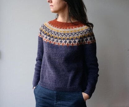 Ninok is knitted from the top down, seamlessly. Throughout the process, several series of short rows are used for a comfortable and beautifully shaped finish. The color work yoke is worked top down and followed by some raglan increases. Sleeve stitches are set on hold , the body is knitted straight on to bottom hem. Then sleeves are knitted in the round also. At the end, the stitches of the neckline are picked up to knit the collar. As the pullover is knitted top down lengths are easily adaptable.