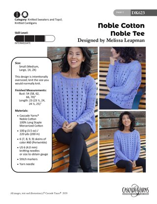 Noble Tee in Cascade Yarns Noble Cotton - DK623 - Downloadable PDF est un modèle de Tricot Intermédiaire gratuit par Melissa Leapman, disponible au format PDF téléchargeable et comprend des instructions en Anglais. Super amusant à réaliser, ce modèle pourrait être votre prochaine œuvre d'art !