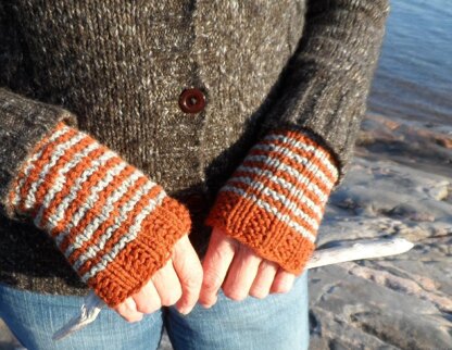 These fingerless and thumbless mitts knit up in no time in worsted weight yarn. Pattern is written for 2 colors, but use just one or as many as you like. Garter rib makes for clean stripes and gives a fun texture. Each mitt is a plain tube with a few increases at the cast-off end to give enough stretch to wear them either way.