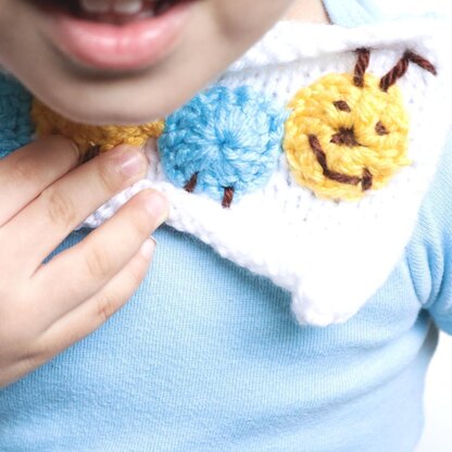 **Yarn:**● Color A - Big Twist Baby Yarn in Dandelion for 2 circles - Size 4 Weight ● Color B - Big Twist Baby Yarn in Bluebird for 2 circles - Size 4 Weight ● Color C - Caron Simply Soft Yarn in Chocolate for legs, antennae, and face- Size 3 Weight