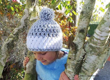 The Nordic snow hat has lots of textural interest. It is made with an easy stitch pattern using super chunky yarn. It has a stunning white snowy stripe of soft chenille bobbles and is just so warm and cosy to wear your child won’t want to take it off!