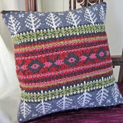 This design was inspired by Jane's trips to Norway. The cushion uses some traditional Scandinavian designs, such as lice stitch, which features on the back lower panel, alongside Jane's own stranded footwork patterns and beaded rows.