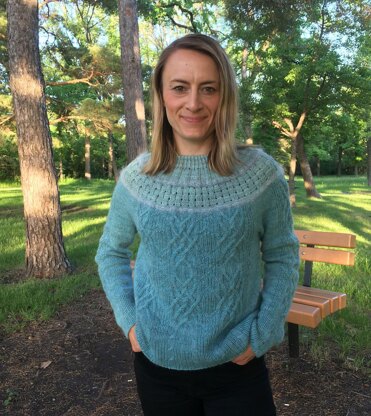 The textured yoke features ribs and lacework (eyelet basketweave). Cable panels intertwined with ribs add light surface texture and flattering vertical flow to the body and sleeves. German short rows raise the back neck for gentle drape around the shoulders.
