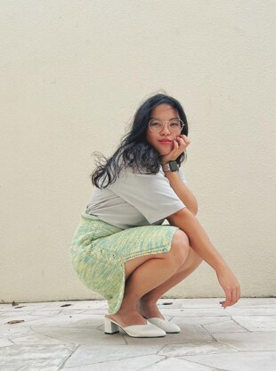 An A-line skirt with a folded waistband, lacy mock cables along the sides and a customizable length. The skirt is knit top-down, in the round. You can choose to make the skirt without the skirt slit. If you choose to split your skirt, subsequent rows will be knitted back and forth. The pattern comes with a schematic and chart for the pattern repeats.