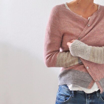 body with color blocking to the bottom ribbing. Pick up the front stitches to work the buttonband for each front.