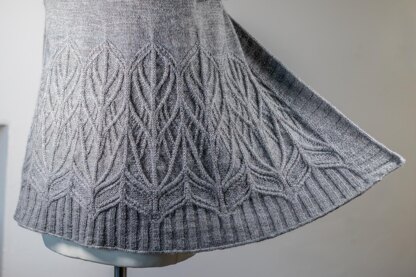 This top-down open-fronted cardigan was inspired by the Art Nouveau-style windows found in some of the buildings at Glasgow University Gardens. The cabled panels at the lower edge of the cardigan create a gentle A-line shape, with curving organic forms that flow across the fabric. The rest of the cardigan is very simple in comparison, making a blank background canvas against which the cable pattern shines.