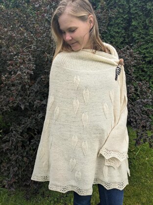 ConstructionThe shawl has a semicircle shape, starting from the middle of the longest side and increasing in rapidly. The construction follows loosely half-pi shawl construction. It has an initial section of broken rib, comfortably simple for easy knitting and body of reverse stockinette where three dimensional leaves are introduced ending with Old Shale border.