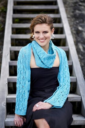 An intricate woven lacy stitch pattern by Lynne Barr is highlighted with the cable structured Softknit Cotton by Rowan in this reversible rectangular shawl that can be buttoned into a shrug. Wear it with a cowl as a collar.