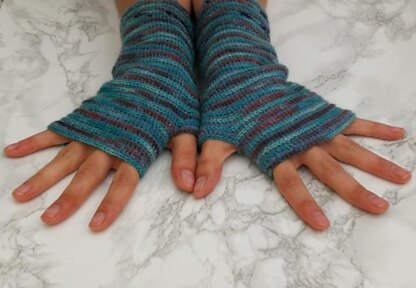 These fingerless mitts are worked with two strands at the same time. A variation of the basic double crochet results in a chain spiraling around the mitts as if it were stitched on. A gusset makes for a great fit, and a missing thumb gives you a quicker result. Pick one solid and one variegated or color changing yarn, or even two gradients to make your personal pair!