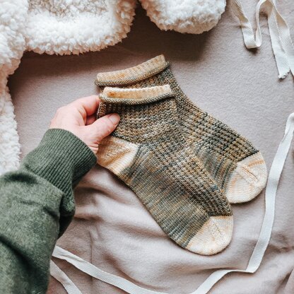 Available in 5 sizes, Nurture are ankle socks knit in the round from cuff to toe. The textured pattern is worked around the ankle and down the front of the foot. The heel is worked using Shadow Wrap short rows, with the toes grafted together.
