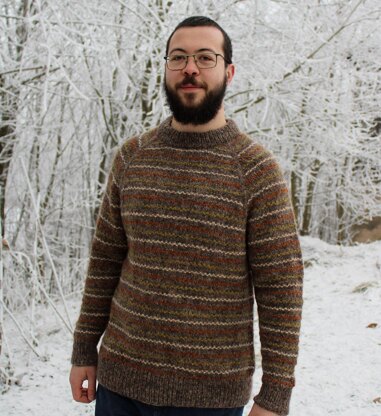 This sweater is knitted in the round from the top-down using raglan increases. A folded collar and some generous ribbing at the hem and cuffs are framing the main pattern (= stripy texture) of this design. “Seams” are created my slipping stitches when using the CC for the raglan lines, at the sides of the body and under the arms.