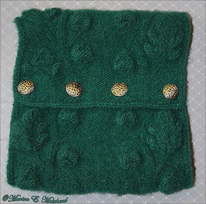 Oak leaf and acorn motifs have both written and charted instructions that feed back into each other to achieve the required length. In addition, instructions for felting and i-cord edgings are included in this 18 page pattern.