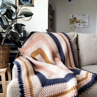 This modern, geometric throw is the perfect snuggly companion for your couch or favorite reading chair. It features category 5 bulky yarn for a quick make, box striped color blocking, and a dotted decorative border.