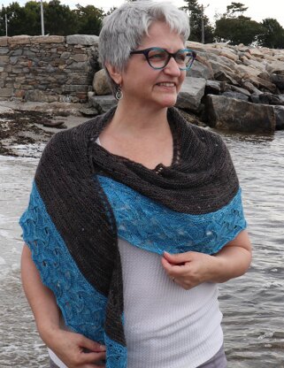 The Ocean Home Shawl is worked from the top down beginning with a garter tab cast-on. The instructions for this cast-on result in a shawl with a nice straight edge that’s a breeze to block without the dreaded garter hump! Once the desired wingspan has been reached, the border of the shawl continues in a lace pattern that’s reminiscent of waves swirling and churning around a rocky shore. Finally your trip to the ocean ends with a bind off that’s stable enough for the shawl’s edge, but stretchy enough to accommodate blocking the watery lace. The top portion is worked in easy going garter stitch that resembles a rocky texture. Rows of “bubbles” are made with simple yarn overs and decreases. The craggy surface combined with the bubbles creates a pleasing texture as well as a rhythmic and calming experience. Pattern also includes an optional chart for the lace section, schematic, mods to change the size, and row tracker.