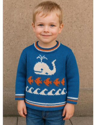 Waves, fish and a friendly whale appear on this ocean knitting pattern for a round-necked sweater for ages 2-7 years.