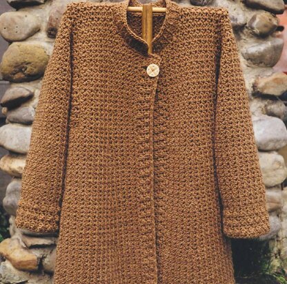 Beautiful mid-thigh length heavy sweater; top button, overlapping down front. Very textured.