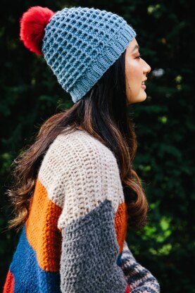 ‘Off Piste’ is a crochet pattern for a cosy, waffle stitch beanie hat with a slight slouch. Finished with a giant pom pom, the textured fabric will keep you warm whether you’re on or off the slopes this winter.