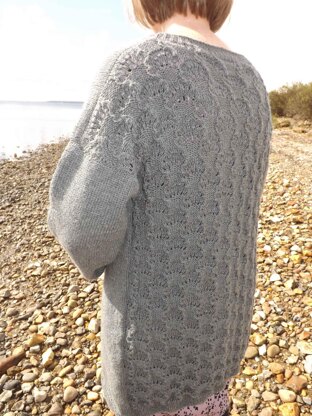 This is a cardigan knitted from the bottom edge and up with a lace pattern on the back. The pattern is made for at yarn with a gauge of 22 stitches per 10 centimeters.