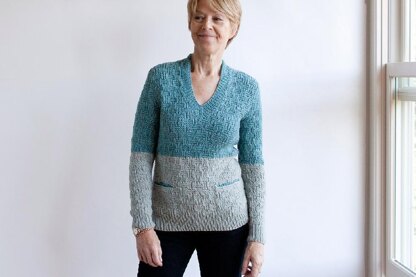 Oh Johnny Lee is a slim, shaped, long-sleeve, hip-length pullover with a v-neckline, worked in 2 colors. Its overall texture is garter and rib check (a 10 st by 12 row repeat) trimmed with 1x1 rib at the bodice and sleeve hems, and neckline. 2 ample pockets are lined with the color of the upper bodice, for balance and fun. The sides of the v-neckline extend up and around to the back, where they are joined and attached to the back neckline – creating a cozy, raised back collar. This piece is worked in the round, from the bottom up, until the start of the v-neckline where it splits and is worked back and forth. Stitches are picked up around the neckline for rib trimming. Set-in sleeves are worked in the round from the bottom up. TECHNIQUES REQUIRED: knit, purl, long-tail CO, ssk, k2tog, p2tog, p2tog tbl, k1-f/b, stitch pick up around neckline, short row shaping and 3 needle BO (at shoulders), and (minimal) seaming. No blocking necessary.