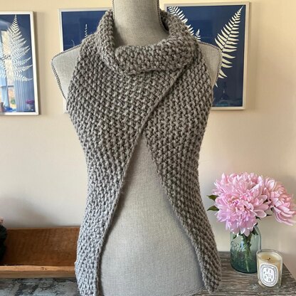 - After completion, a button is added at the neckline to secure one flap at the shoulder to create a chunky turtleneck look for wearing the vest closed.