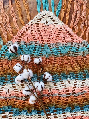 What you need: 2 skeins of Caron Skinny Cakes -any color you would like Approximately half of the skein for tassels (optional) Crochet Hook: G/7 (4.50 mm) Shawl measures “8ft 5inch” (280 cm) wide x “3ft 2inch” (100 cm) deep at center point.