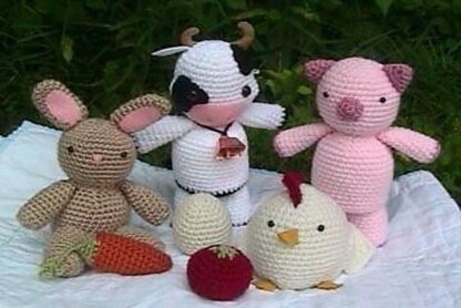This Amigurumi Crochet pattern includes instruction for the following: Cow, Pig, Rabbit, Chicken, Egg, Tomato, and Carrot. Very simple instructions that are worked in a spiral, with pictures and felt templates to cut out. The cow, pig, and rabbit can be made sitting down or stand on their own.