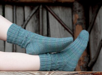 Comfy socks with deep ribbing and lace pattern on the leg. The lace pattern is provided in charted and written form. Two sizes are provided - size small fits foot circumference 18-20cm and size large fits foot circumference 23-25.5 cm.