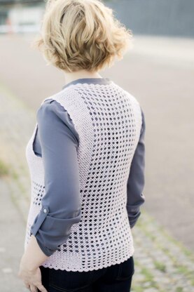 Olga is a light sleeveless top worked bottom up in two pieces and then seamed. It features a modified boat-neck, a loose fit around the waist, two horizontal mesh panels below the bust and a vertical mesh panel running down the back. The neck, the armholes and the bottom are edged with a simple scalloped border.