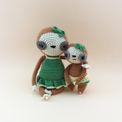This is Olivia and Mia, the sweetest crochet sloth mama and baby. Olivia wears a lovely sundress and Mia wears a striped skirt. Both sloths are wired but it is optional. Olivia and Mia are made with 2.5 mm crochet hook and they are 21 cm / 8 inches and 12 cm / 5 inches tall. Their measurements will change depending on the hook and yarn you use. The pattern is written in English with US American crochet terms. The pattern is 18 pages long and contains step by step instructions and lots of detailed pictures to help you along making the both of the sloths. The instructions are detailed and easy to follow if you know the basic stitches and techniques used to make amigurumi. I would recommend it for advanced beginner with a little experience in amigurumi. Also, included is a materials list and notes and tips to help you finish your doll.