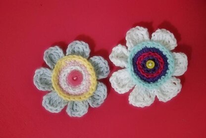 Made with your choice of yarn and hook size, the flower can be worked up in a variety of sizes and colors. (The pictured flower was worked in worsted weight cotton with a G hook.) Perfect for using those bits and pieces in your stash.