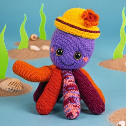 Ollie the Octopus is ready for an exciting day under the sea, and waves hello eight times with their colourful tentacles. This cuddly octopus toy is knit mostly in stockinette with simple increases and decreases for shaping, and a little embroidery to add the finishing details. The little flower decoration on the hat uses short rows to shape the petals. Designed by Amanda Berry @fluffandfuzz, the octopus is knitted in acrylic DK yarns on single pointed needles (not in the round). For confident beginners and above, other techniques used include casting on and off, knits, purls, increases and decreases, short row shaping and seaming to finish.