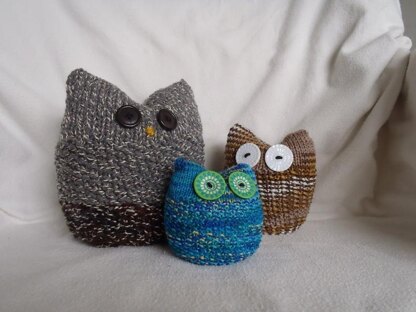 The owlet is approximately 5" / 13 cm tall. The owlet is knitted from bottom to top, in the rounds, moss stitch gives the body some texture. The top is joined together with Kitchener stitch. You will need about 60 - 100 yards of yarn. You will also need 2 buttons for the eyes. The pictured owlets are done in three various weight of yarn. It's a great stash buster.