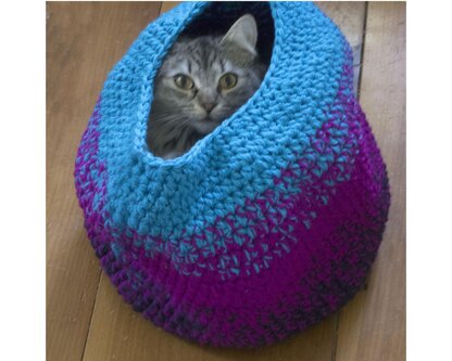 American crochet terms. This is an easy pattern for a crocheted cat cave/pod. It is thick and strong but still soft and flexible. Our kitty Summer loves to snuggle in and also play, rolling around inside. The cave is crocheted in an ombre pattern with colors merging slowly into each other. The cave in the photo is about 12 inches high and 16 inches across, large enough for most kitties though it can easily be made smaller or larger. You can use any worsted weight yarn. You may sell the pods but please don't sell the pattern or share it except by a link to this listing.