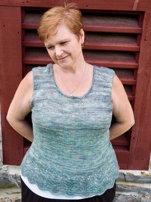 On the Breeze is a bottom-up, sleeveless, three-season top with a deep lace hem. There is optional waist shaping for a more feminine silhouette. Yankee Breeze is a wool/cotton blend yarn suitable for three seasons and makes for a feminine top to dress up or down.