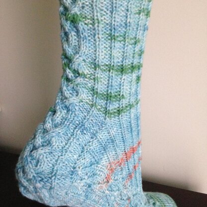 A cable works its way down the back of the sock, continuing through the heel flap. After picking up the gusset stitches, the cable pattern is converted to a twisted stitch pattern that travels along the foot, eventually running side by side.