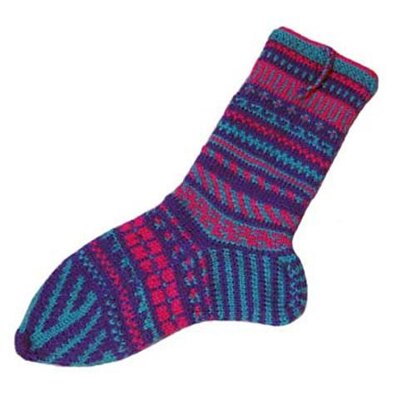 Construction: In the round on 5 double-pointed needles (4 holding, 1 working). Toe up starting with wrapped cast on, and striped band heel with flap but no gusset. Top finished with eyelets and (optional) Bosnian Slip-Stitch Crochet edge. Braided tassel, also optional.