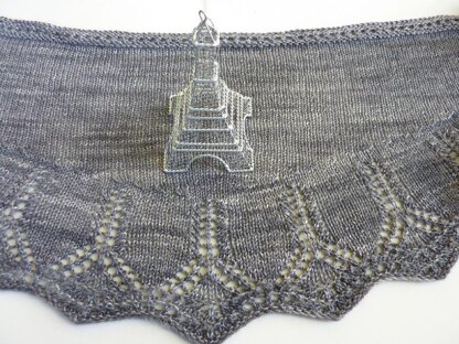 A life-long love affair with all things French is the inspiration for this lacy edged shawlette. The knitting begins at the lower edge with waves of lace like a can-can dancer's frilly petticoat, and continues with a row of iconic Eiffel Towers. This crescent shawlette is shaped with simple short rows, and finished with a garter stitch eyelet border at the upper edge. Ooh la la!