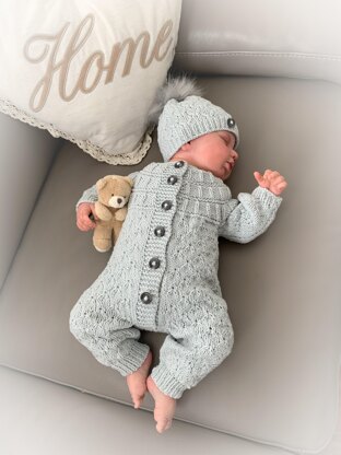 A modern design baby romper, knitted from the top down on single pointed needles.